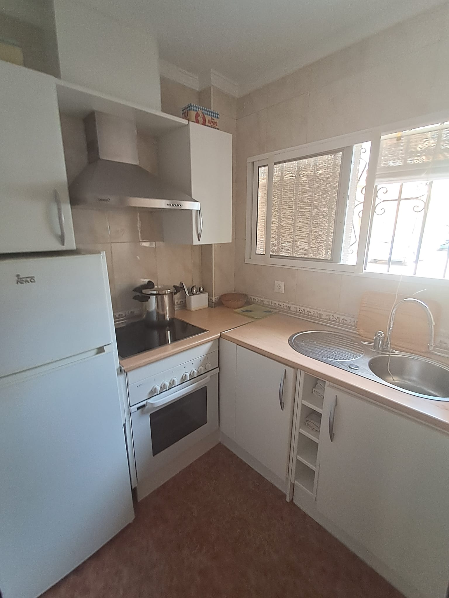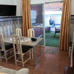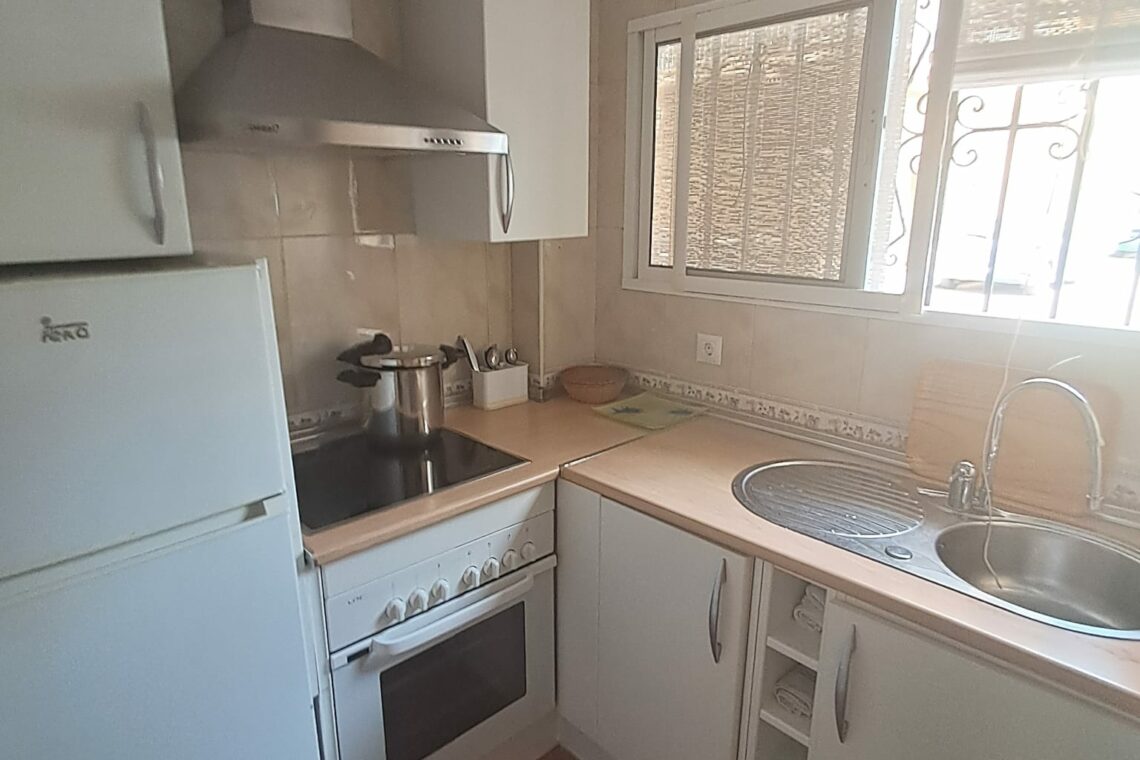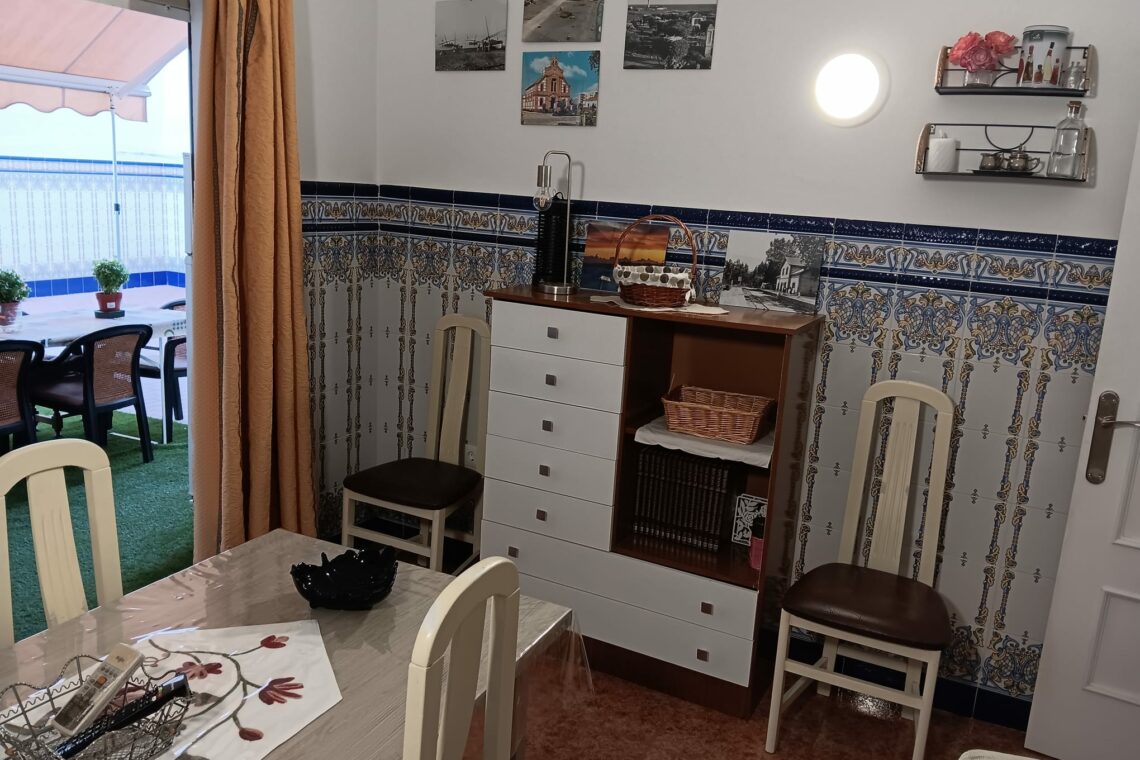 La vivienda cuenta con tres dormitorios, un baño completo, cocina equipada y un amplio salón con aire acondicionado, ideal para relajarse después de un día de playa.
